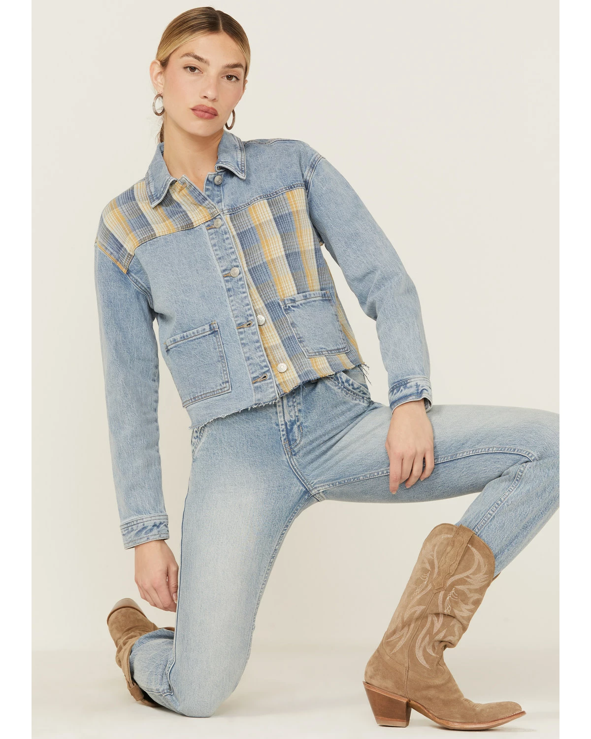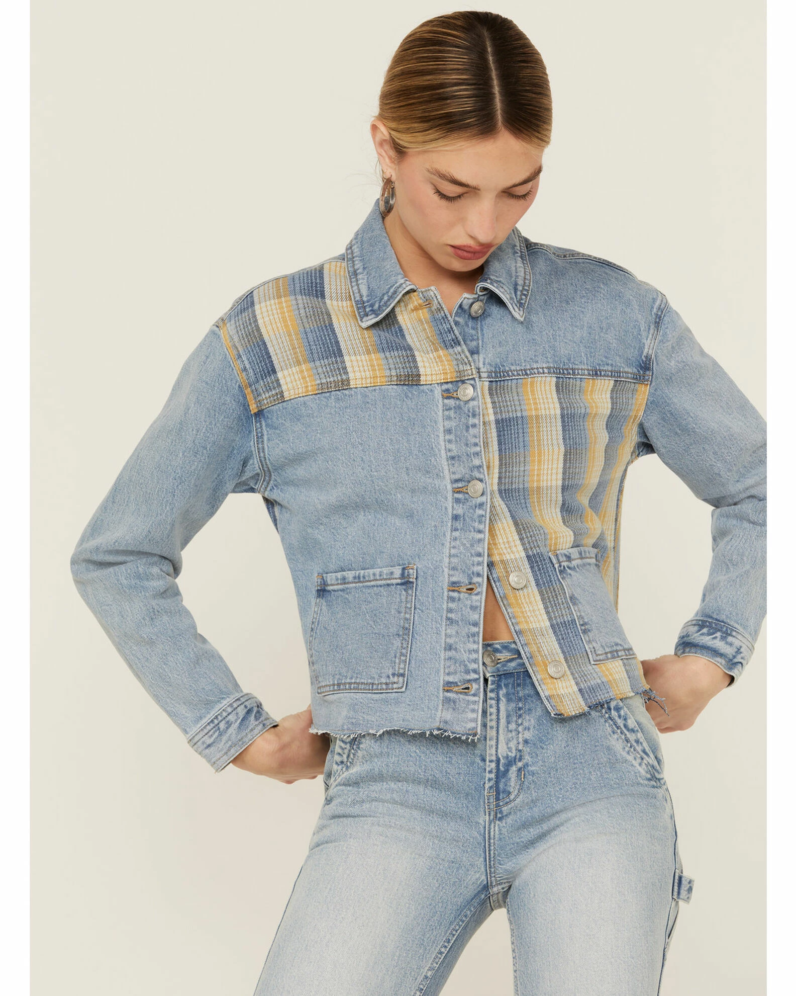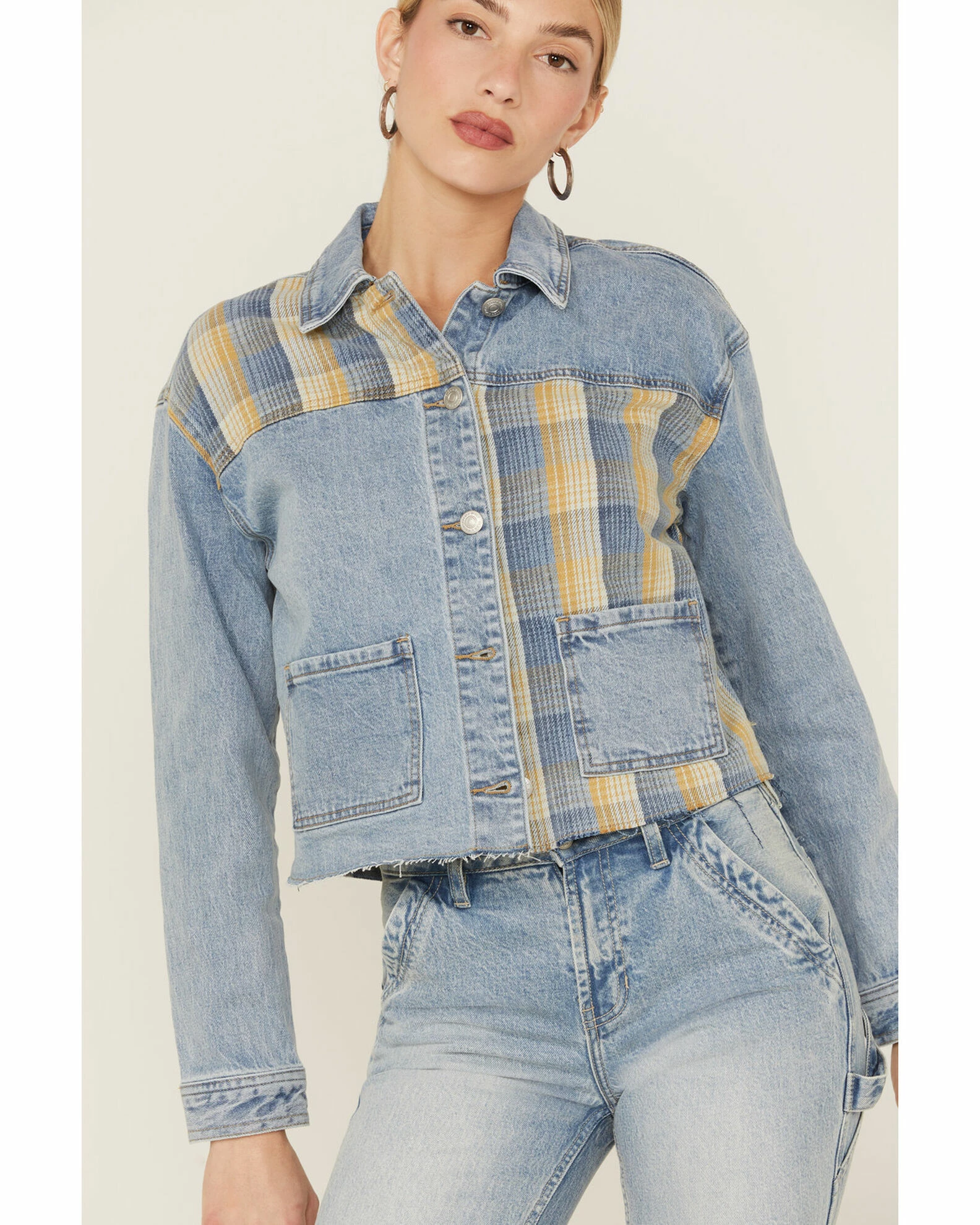 Be the first to review “Cleo + Wolf Women’s Oversized Plaid Mix Denim Cropped Jacket Light Medium Wash” Cancel reply